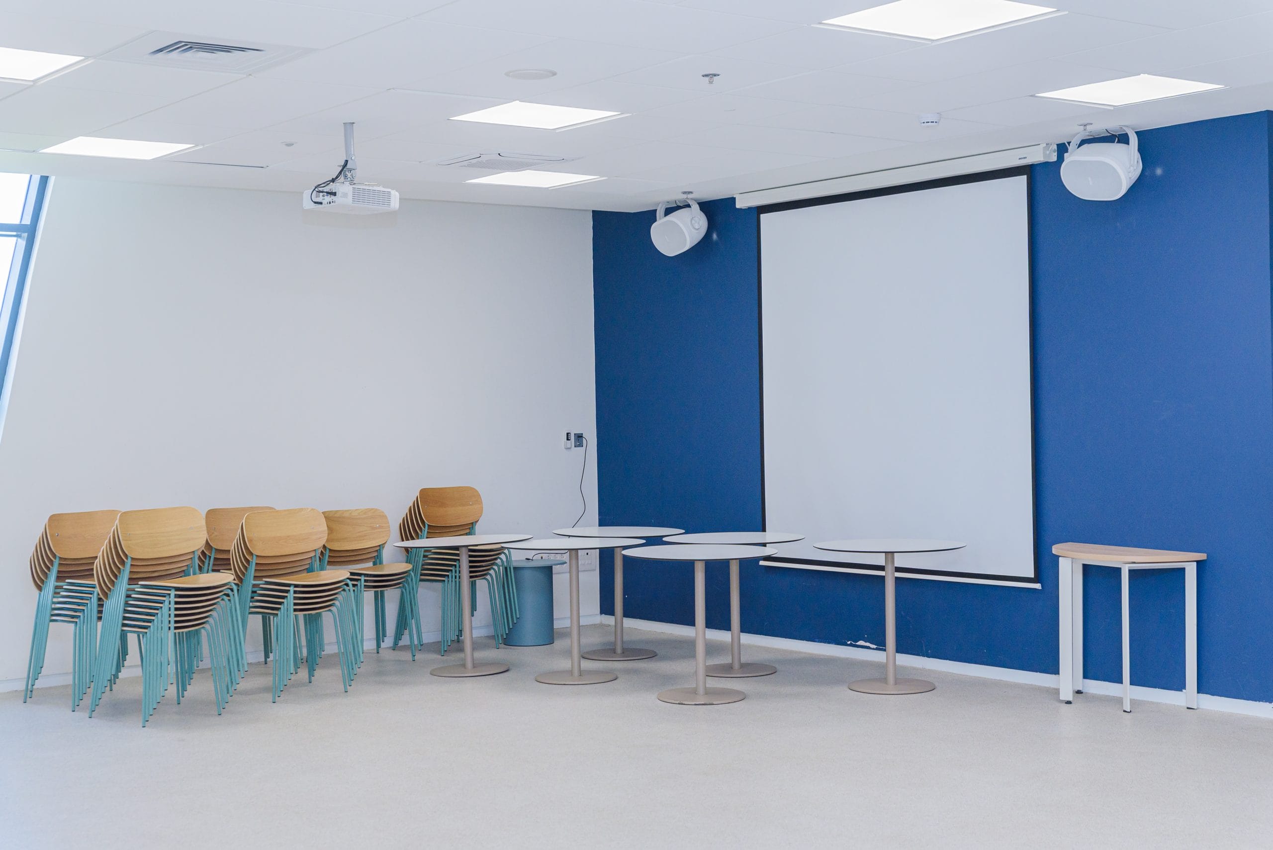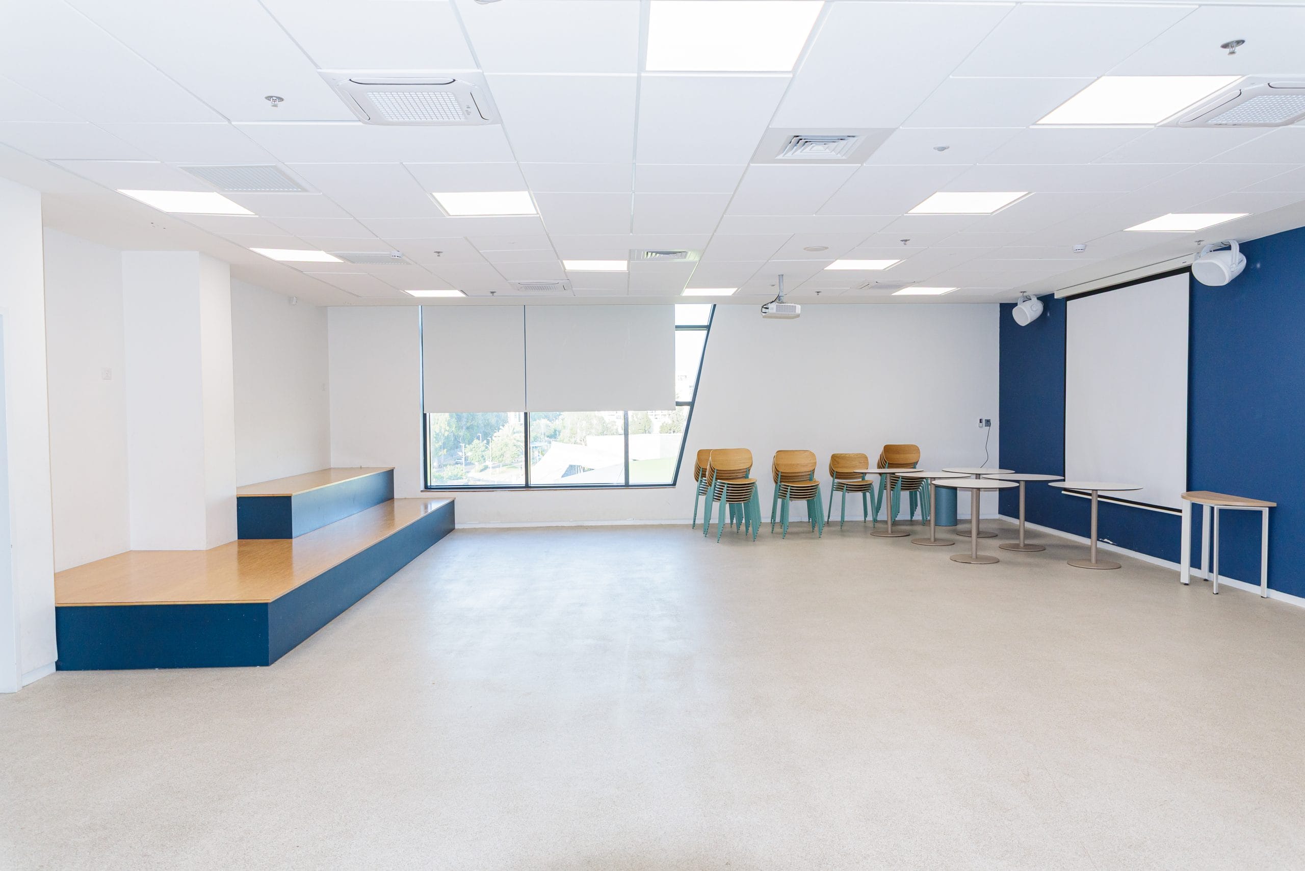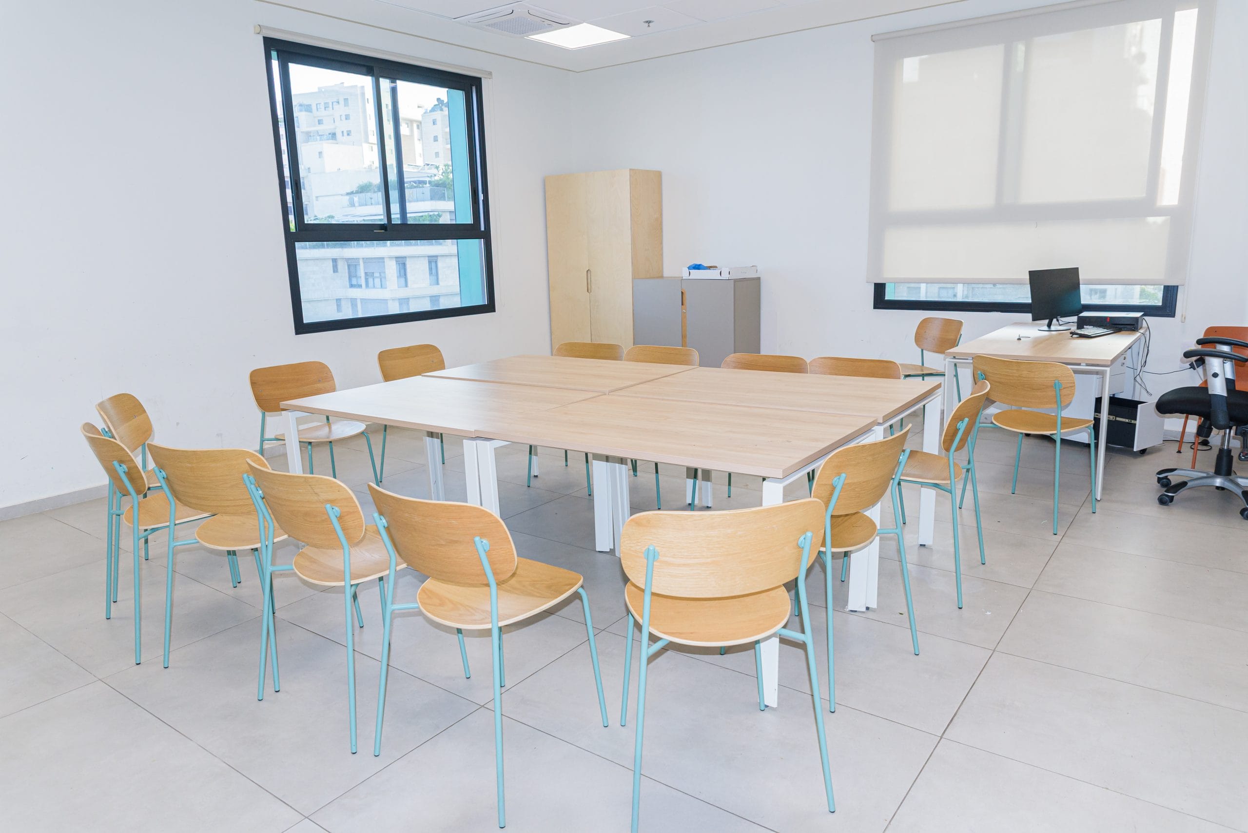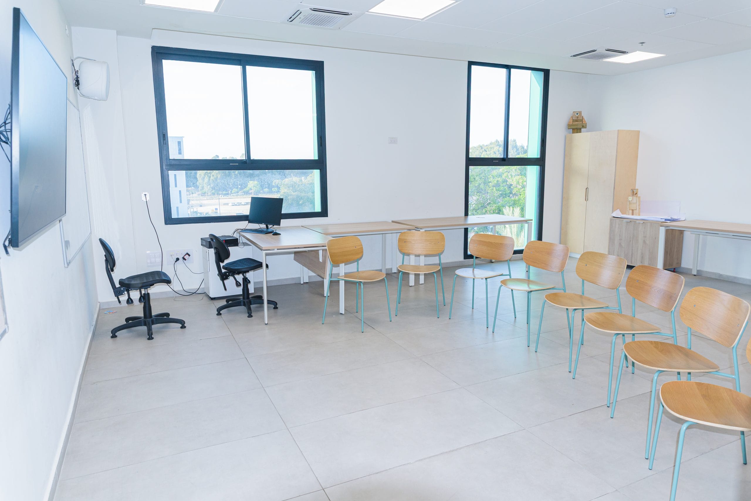 ציוד זמין בכל הכיתות והחללים: שולחנות, כיסאות, מסך ומקרן, לוח מחיק, אינטרנט אלחוטי.